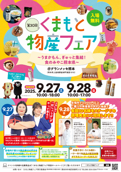 「第30回くまもと物産フェア」開催のお知らせ 2025.09.22 お知らせ 熊本県の特産品が集まった物産フェア。自慢の商品が勢ぞろい! 特別イベントや展示ブースなど、楽しいコンテンツが盛りだくさん! ぜひ会場にお越しください。 【くまもと物産フェア公式HP】 https://kumabutsu.com/ Tweet Share