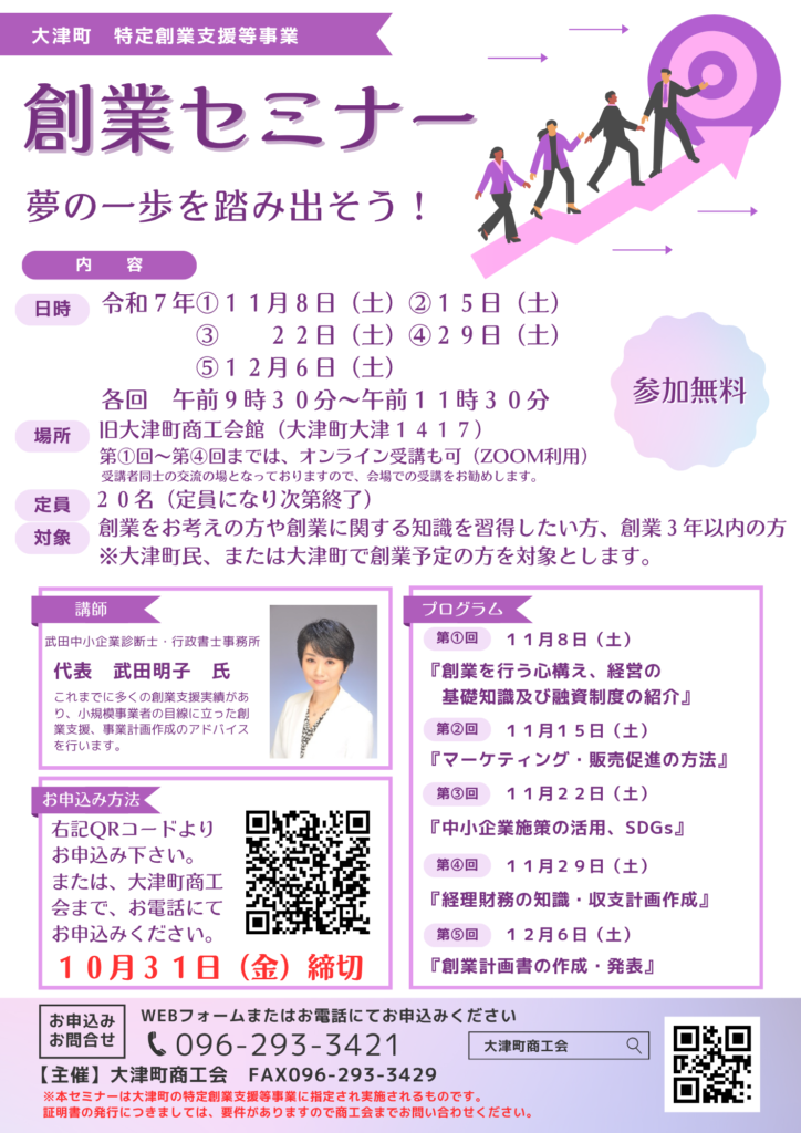 申込:以下URL・チラシのQRコードからお申込み、または、大津町商工会(☎096-293-3421)に